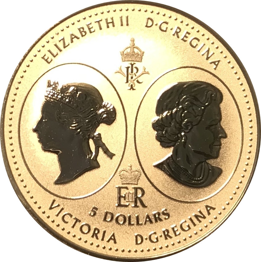 Описание: Изображения королевы Виктории, выполненные Леонардом Чарльзом Уайоном, и Ее Величества королевы Елизаветы II, выполненные Сюзанной Блант, вместе с королевским шифром каждого монарха.