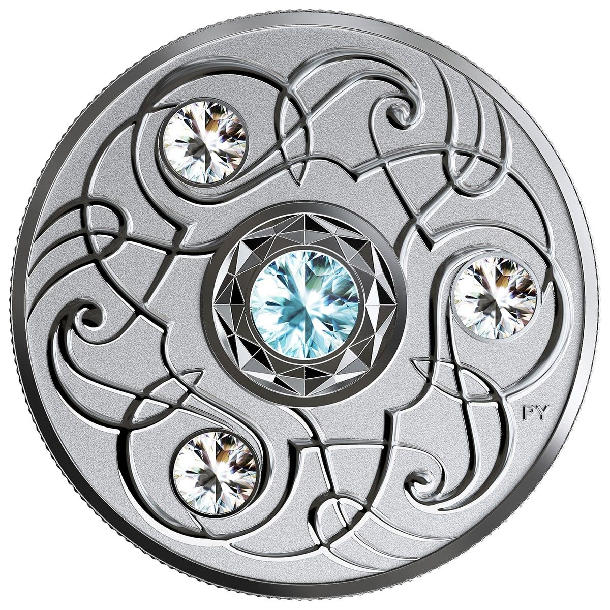 Описание: Дизайн реверса, созданный художницей Пандорой Янг, представляет собой пересечение искусства и математики и отличается стилизованным узором, расположенным в соответствии с шестиугольной системой счисления. Вдохновленный кельтским трискеле, гравированный узор включает в себя три прозрачных кристалла Swarovski®, символизирующих камни месяца марта, представленные драгоценным кристаллом Swarovski® в центре монеты.