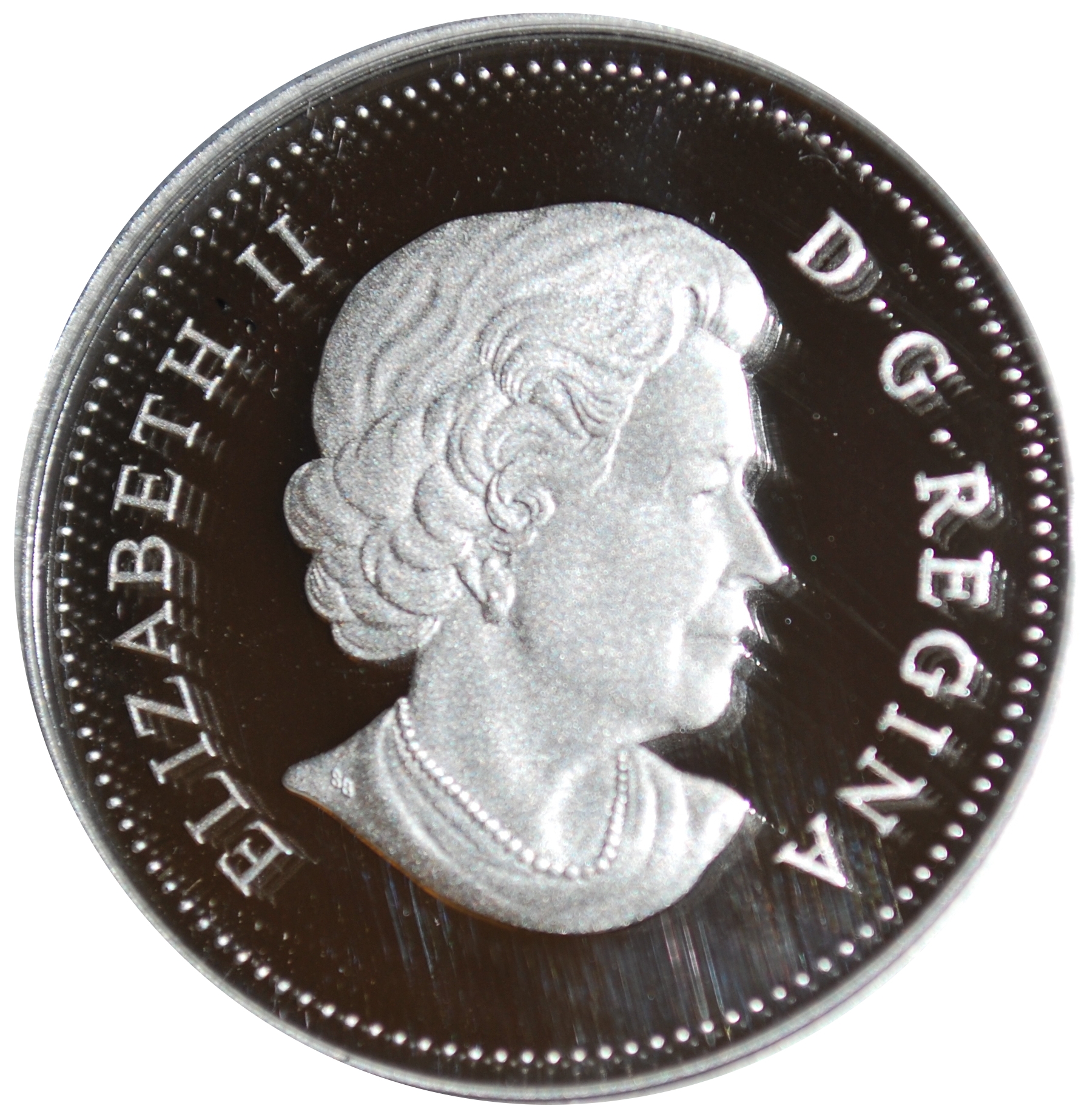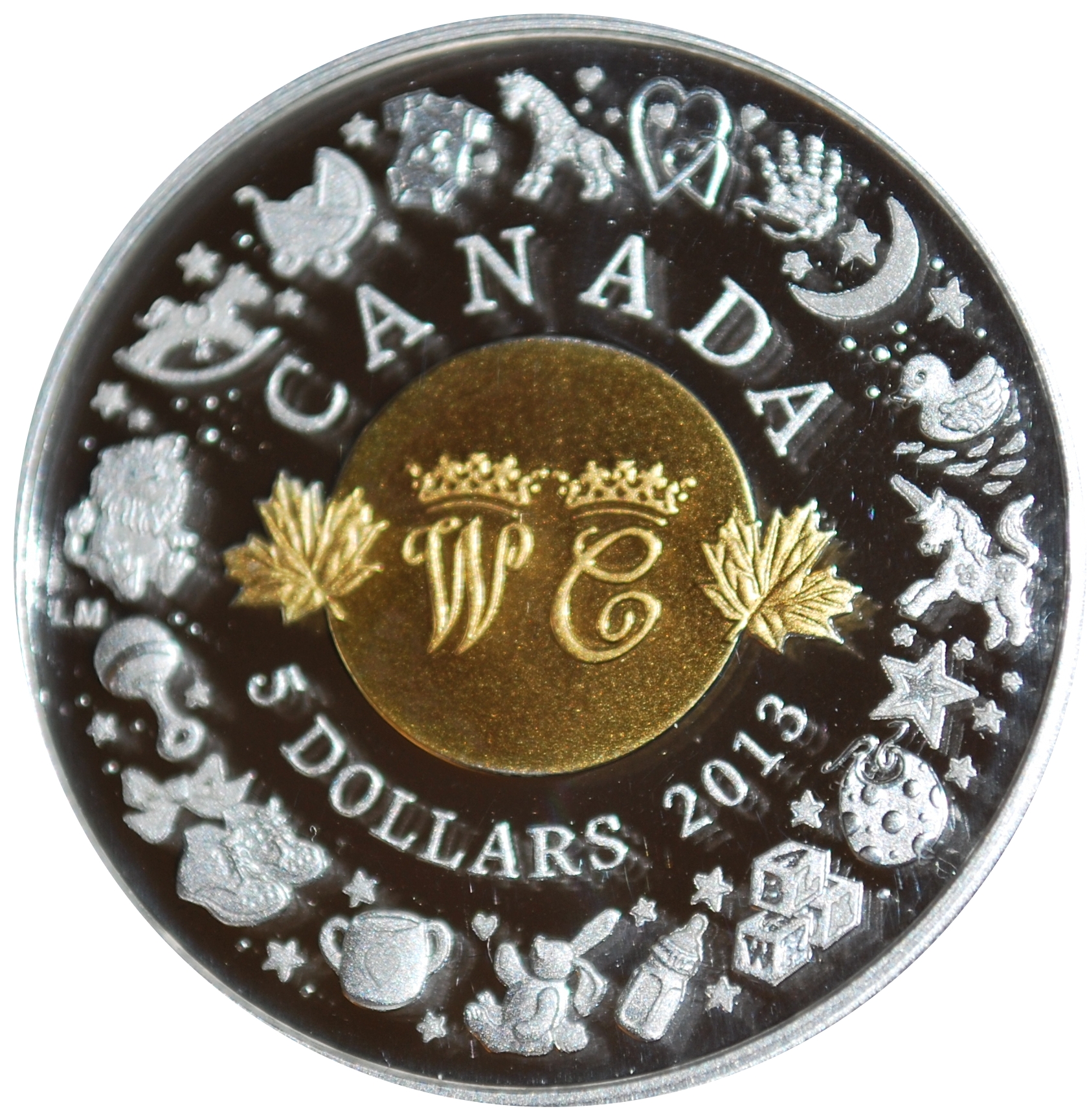 Описание: Символи королівської пари, оточені двома канадськими кленовими листям, все оточене іграшками або символами дитинства. Символи та кленове листя покриті позолотою.
