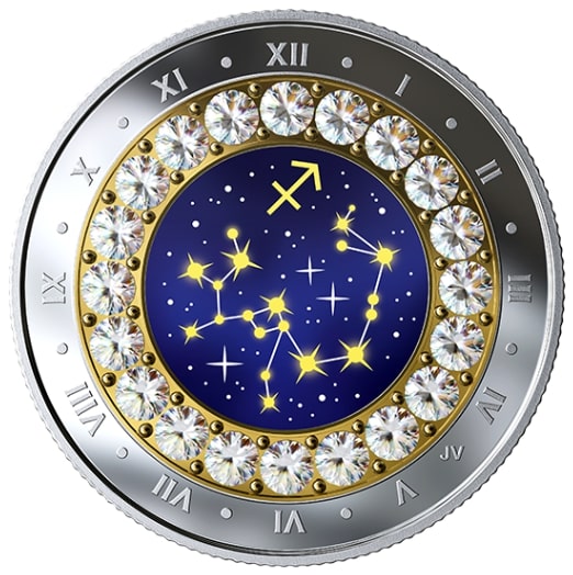 Описание: На зворотному боці монети, створеному художником Йорі ван дер Лінде, зображено гравіроване зовнішнє кільце з римськими цифрами, що нагадує класичний годинник. Внутрішнє кільце з кристалів Swarovski® оточує барвисте зображення на тему зодіаку, яке поєднує сузір'я та символ, пов'язані зі Стрільцем (22 листопада – 21 грудня).