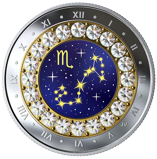 Описание: На зворотному боці монети, створеному художником Йорі ван дер Лінде, зображено гравіроване зовнішнє кільце з римськими цифрами, яке нагадує класичний годинник. Внутрішнє кільце з кристалів Swarovski® оточує барвисте зображення на тему зодіаку, яке поєднує сузір'я та символ, пов'язані зі Скорпіоном (23 жовтня – 21 листопада).