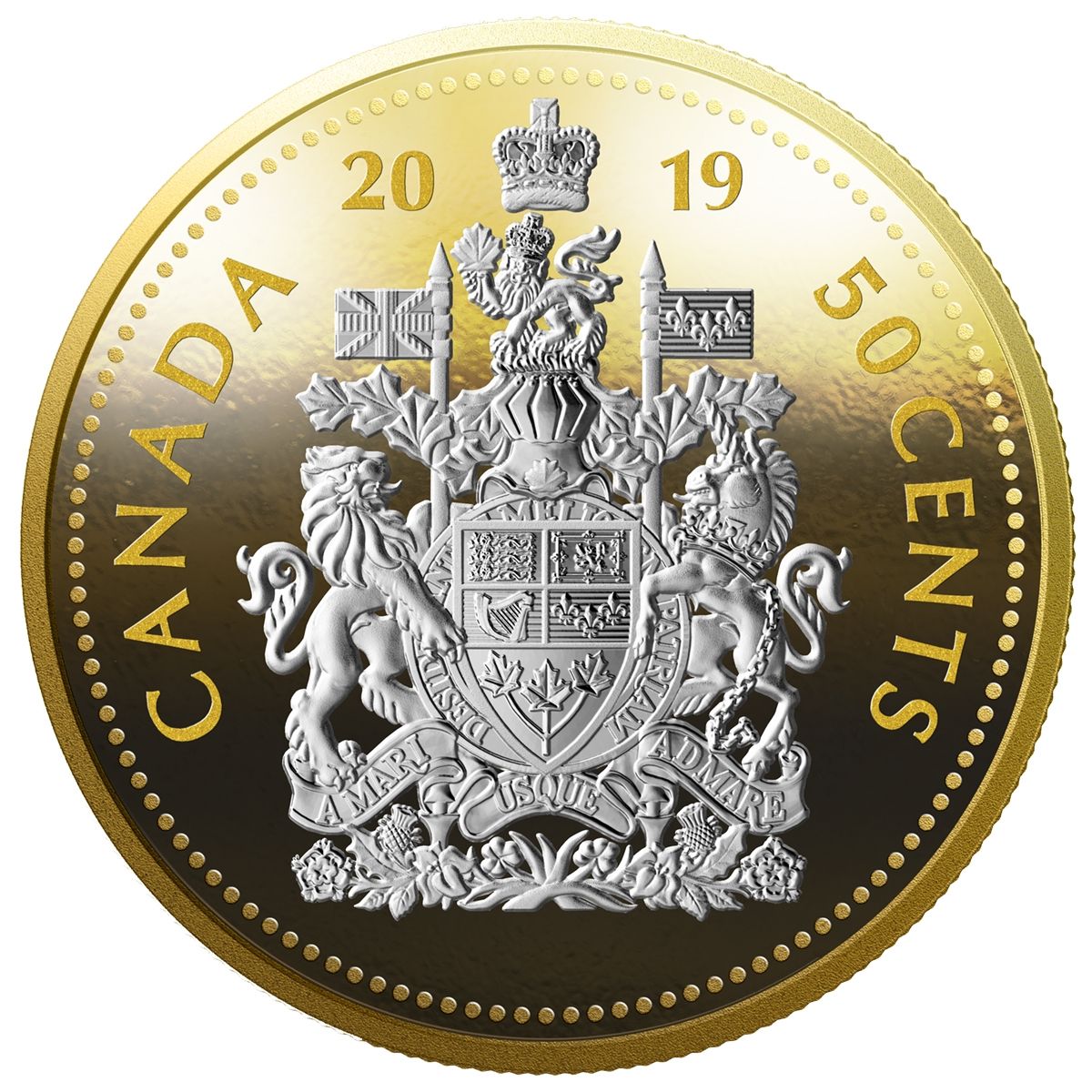 Описание: Створений канадським гравером Томасом Шінглсом, дизайн на звороті представляє герб Канади. Ліворуч від щита лев тримає прапор Великої Британії, а праворуч від щита єдиноріг несе прапор, прикрашений трьома ліліями. Щит розділений на п'ять частин, на яких зображені історичні емблеми Англії, Франції, Шотландії та Ірландії, а також гілочка з трьома кленовими листками, і оточений стрічкою з девізом Ордена Канади: Desiderantes meliorem patriam (Вони прагнуть кращої країни). Над щитом розташований королівський шолом, оточений гірляндою з кленових листів, а на гребені шолома зображений лев у короні, що тримає кленовий лист. Над левом, що символізує суверенітет Канади, знаходиться корона Святого Едуарда, що представляє конституційну монархію Канади. У нижній частині щита знаходиться стрічка з девізом A Mari usque ad Mare (Від моря до моря) і гірлянда, складена з квіткових емблем Англії, Шотландії, Франції та Ірландії.