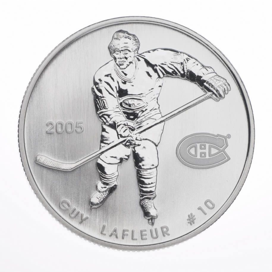 Описание: Гай Лафлёр № 10 играет в хоккей с логотипом «Монреаль Канадиенс» справа и датой слева.