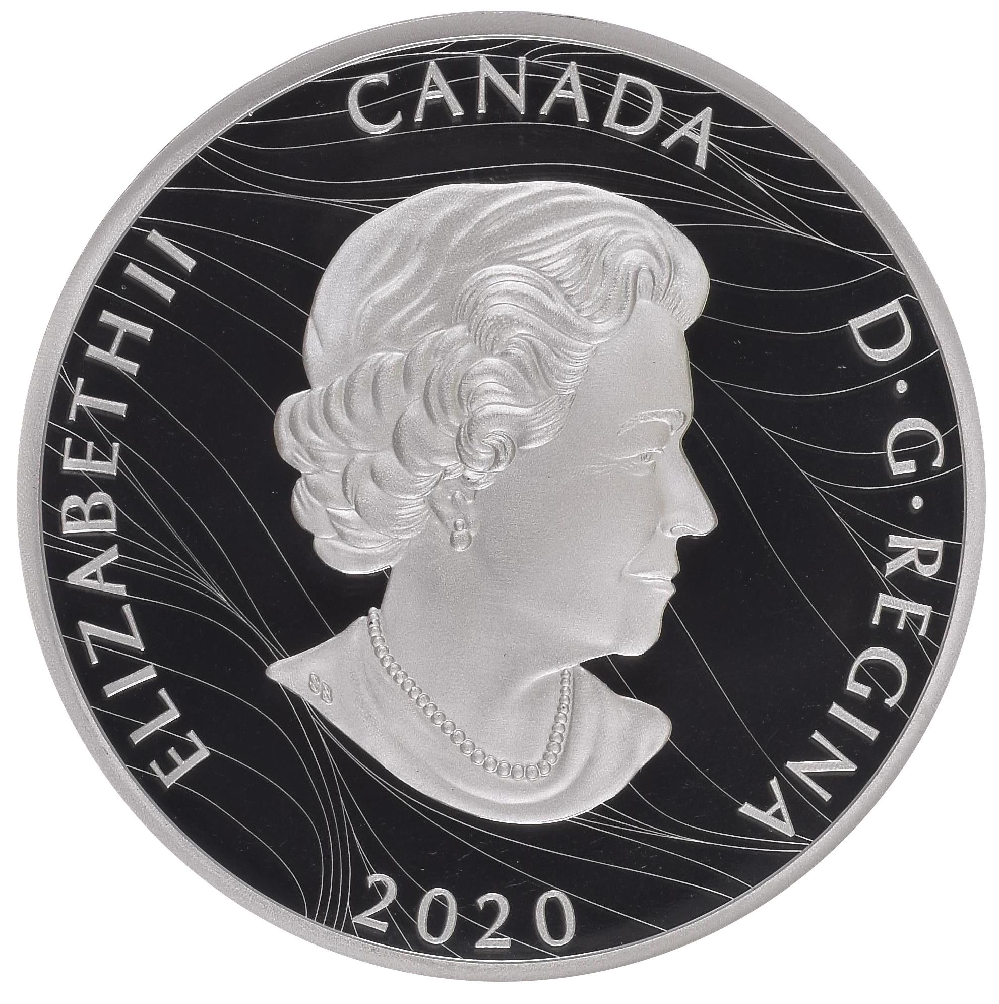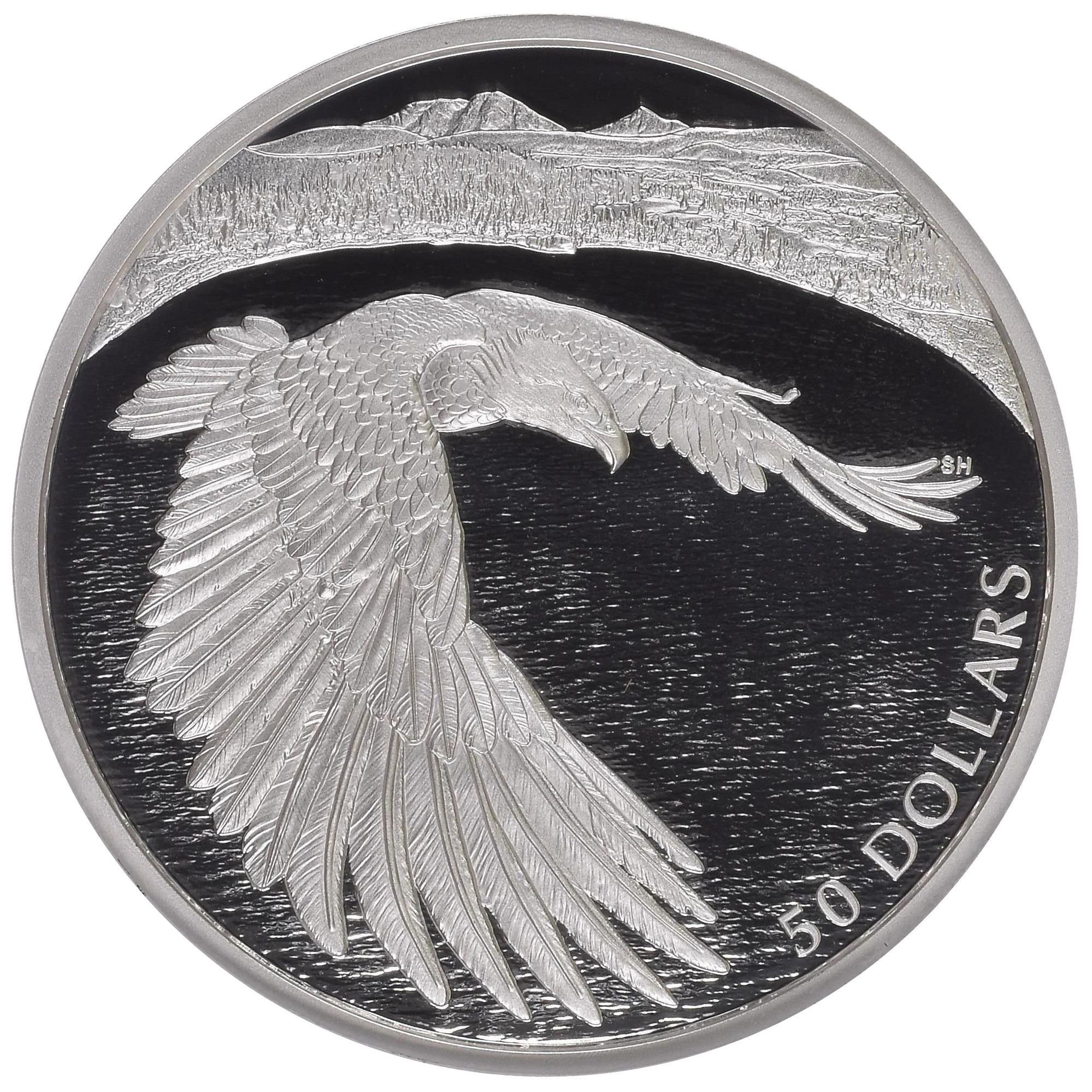 Описание: На реверсе монеты изображен белоголовый орлан, парящий высоко над побережьем, в этом драматичном дизайне канадского художника Стива Хепберна. Крылья орла расправлены с силой и уверенностью, каждое перо изображено с великолепной детализацией. Его маховые перья простираются по нижней части монеты, притягивая взгляд к плечу орла, его интенсивно сфокусированному профилю и мерцающей воде внизу. Зритель получает ощущение, что он парит вместе с этим величественным хищником, наслаждаясь привилегированным видом на побережье и горы вдали.