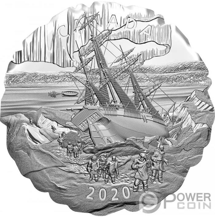 Описание: Изображение экспедиции Франклина (1845-1848). Волнистый край монеты напоминает зубчатый лед, который на реверсе прочно удерживает корабль HMS Terror. В отчаянной попытке выжить, выжившие члены экипажа и офицеры покидают корабль, а одна группа вдали тянет спасательную шлюпку к острову Кинг-Уильям.