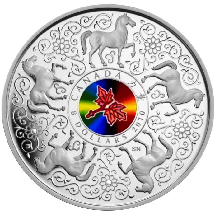 Описание: Пять лошадей шествуют вокруг красочного голограмма с изображением двух кленовых листьев. С декоративным узором на фоне общий дизайн этой монеты повторяет богато украшенное искусство, типичное для китайской керамики, вышивки и скульптуры. В китайской культуре лошадь является символом силы. Это седьмой знак китайского зодиака и важный символ статуса, часто изображаемый на статуэтках, найденных в захоронениях важных фигур китайской истории. Иероглиф, обозначающий силу, — «ли». Кажется, что лошадь имеет естественную связь с этим символом, потому что ее форма напоминает плуг и лемех, используемые в сельском хозяйстве. В центре дизайна находится голограмма с мерцающим кленовым листом — символом Канады.