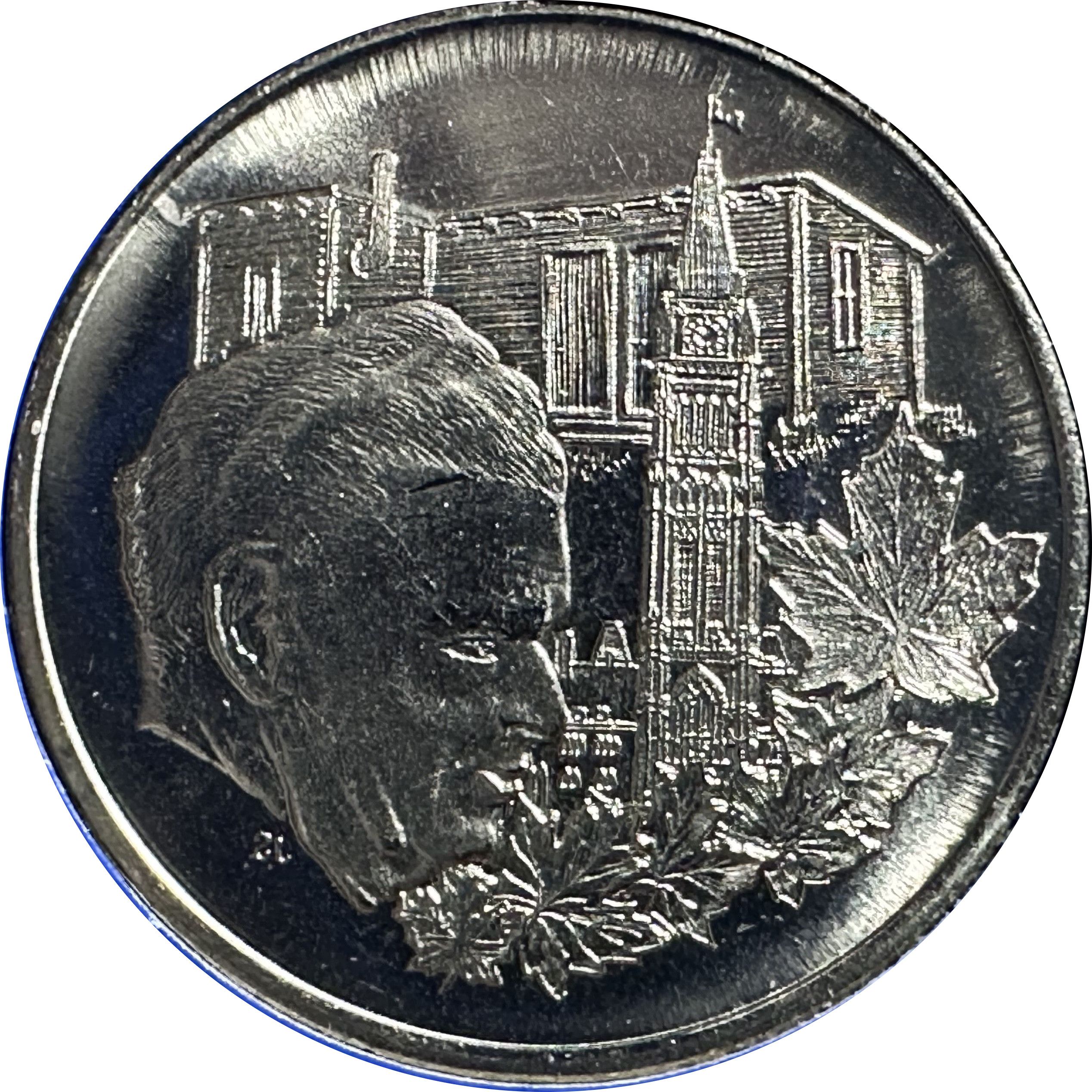 Описание: Комбіноване гравіювання із зображенням бюста Джона Г. Діфенбейкера; його родинного маєтку поблизу Бордена, Саскачеван; Вежі миру канадського парламенту; та групи з 6 кленових листків.