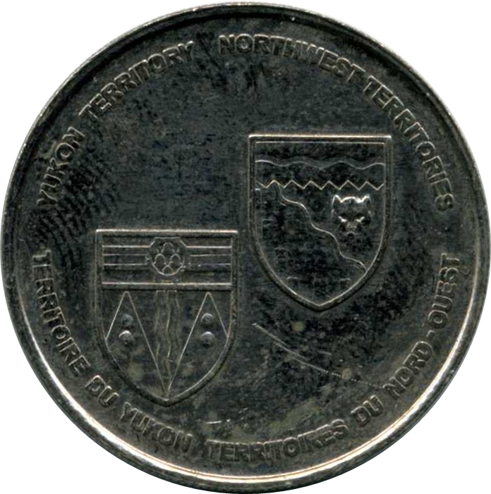 Описание: Герби Юкону та Північно-Західних територій з їхніми назвами англійською (вгорі) та французькою (внизу) мовами.
