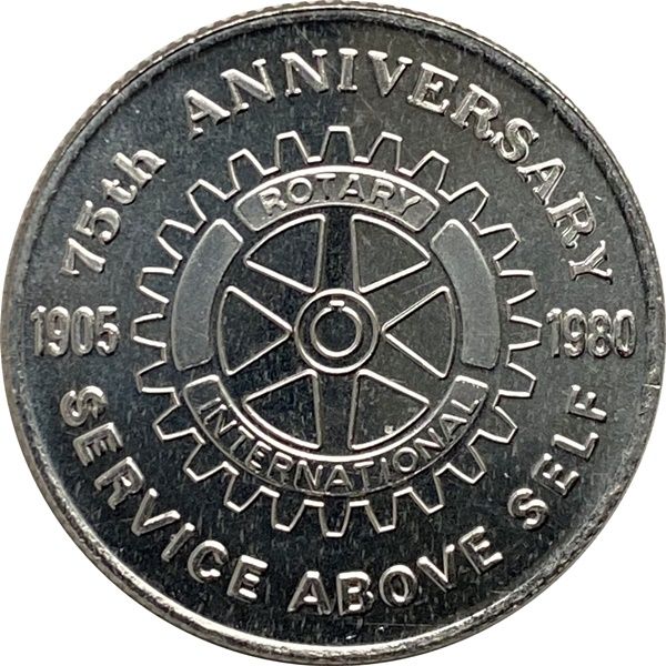 Описание: Чотири круглі символи, зображені за годинниковою стрілкою, починаючи з 12 години: шестерня (Rotary International); дві гілочки пшениці (голод); сім'я з 4 осіб — дитина, дорослий, дорослий, дитина (людство); кадуцей (здоров'я)