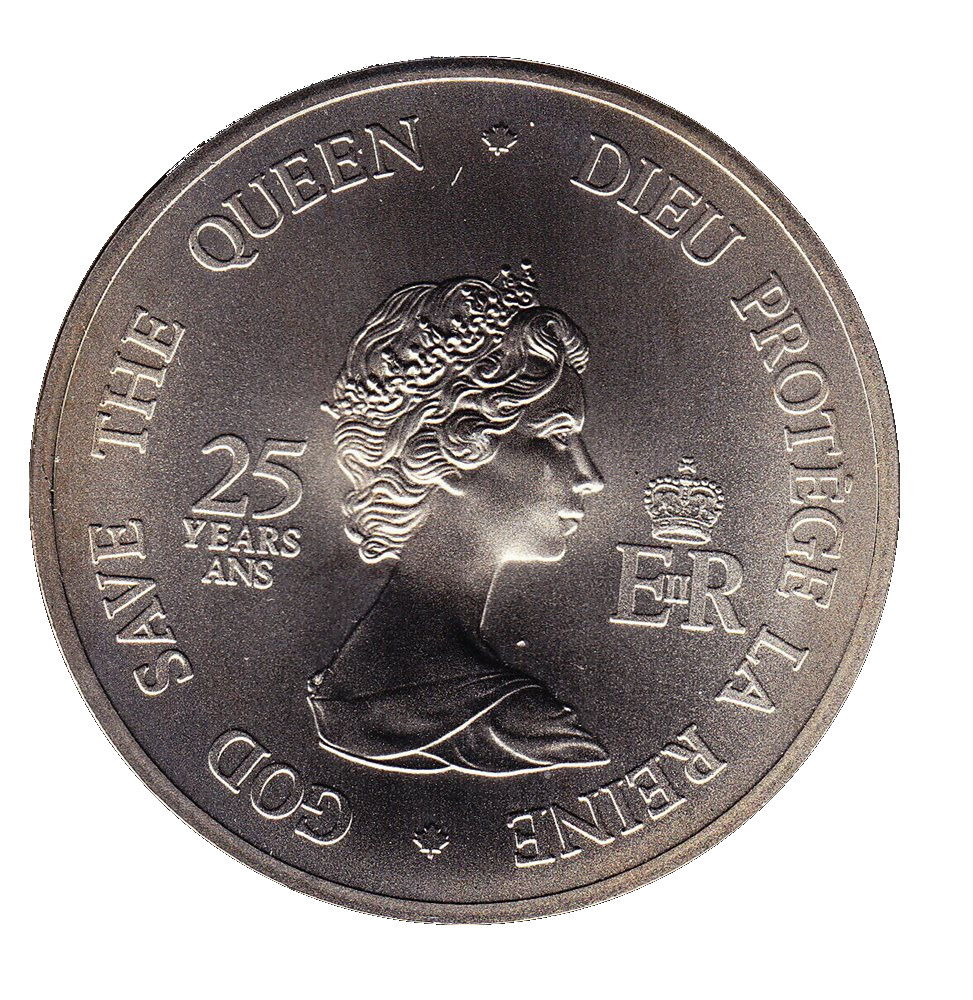 Описание: Профіль коронованої Єлизавети II з написом «25 років/ans» ліворуч і монограмою королеви Єлизавети II праворуч, увінчаною короною Святого Едуарда. По колу напис «Боже, бережи королеву».