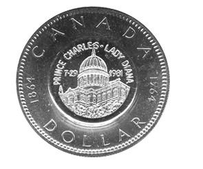 Описание: На зворотному боці монети викарбувано зображення купола собору Святого Павла з написом «Prince Charles • Lady Diana 7-9 1981 and © Wacks» (Примітка: напис може відрізнятися залежно від року випуску канадського срібного долара, який використовується для зворотного штампу).