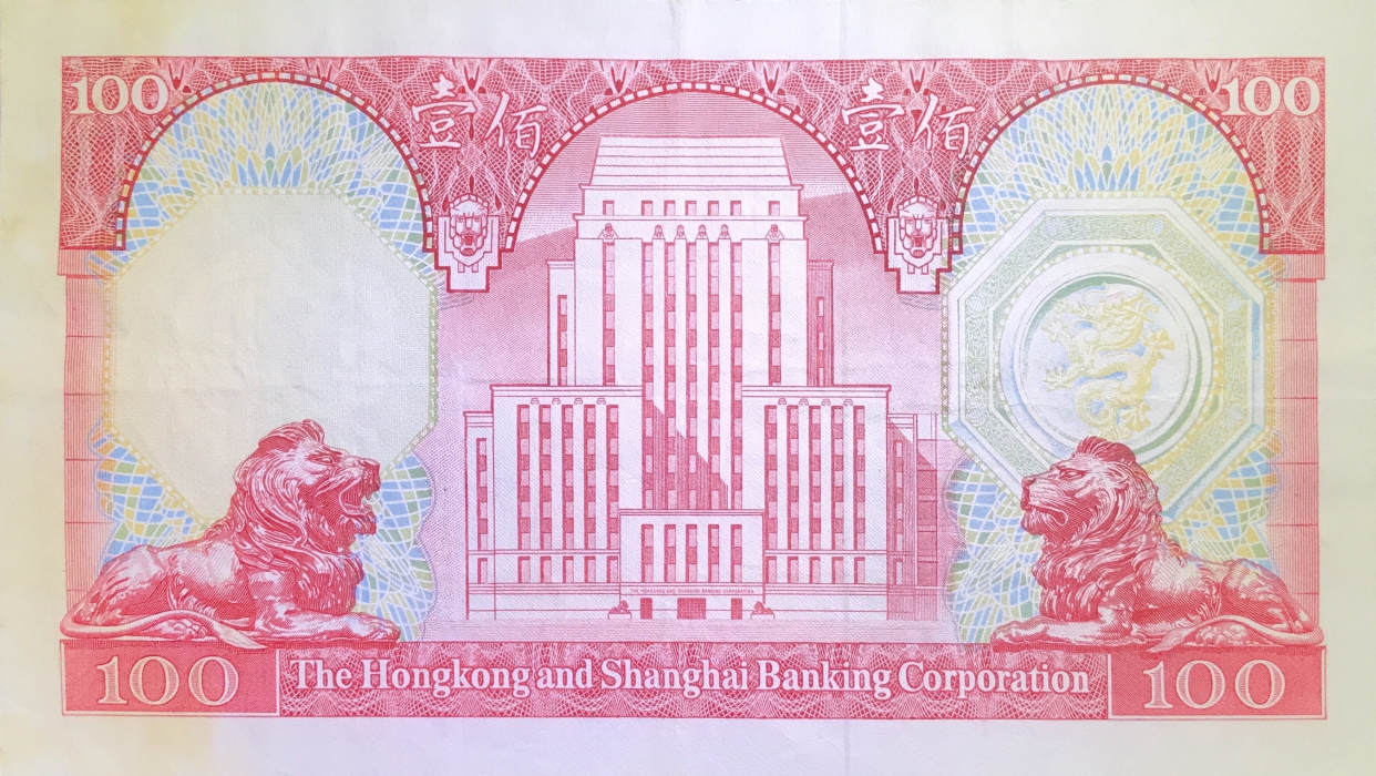 Описание: Четыре номинала, указанные вверху, два арабскими цифрами и два традиционными китайскими. Дизайн разделен на три арки. Старая штаб-квартира HSBC под центральной аркой, восьмиугольное окно с драконом и узорами под правой аркой, пустое восьмиугольное окно для водяного знака под левой аркой. Львы HSBC Стивен и Ститт, а также два номинала, написанные арабскими цифрами в левом нижнем и правом нижнем углах. Название банка внизу.