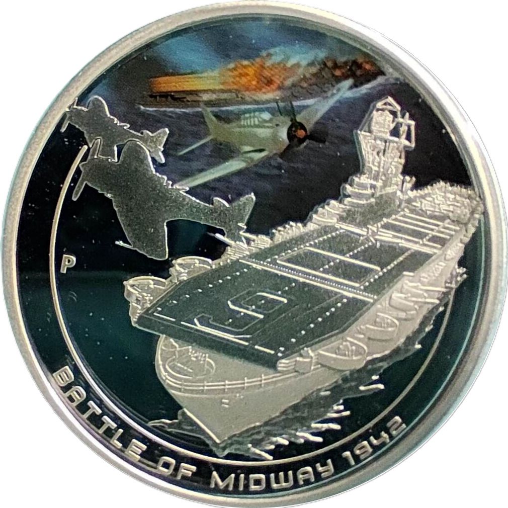 Описание: На реверсі монети зображено авіаносець USS Enterprise класу Yorktown. Дизайн включає кольорове зображення американського пікірувального бомбардувальника над японським авіаносцем Akagi.