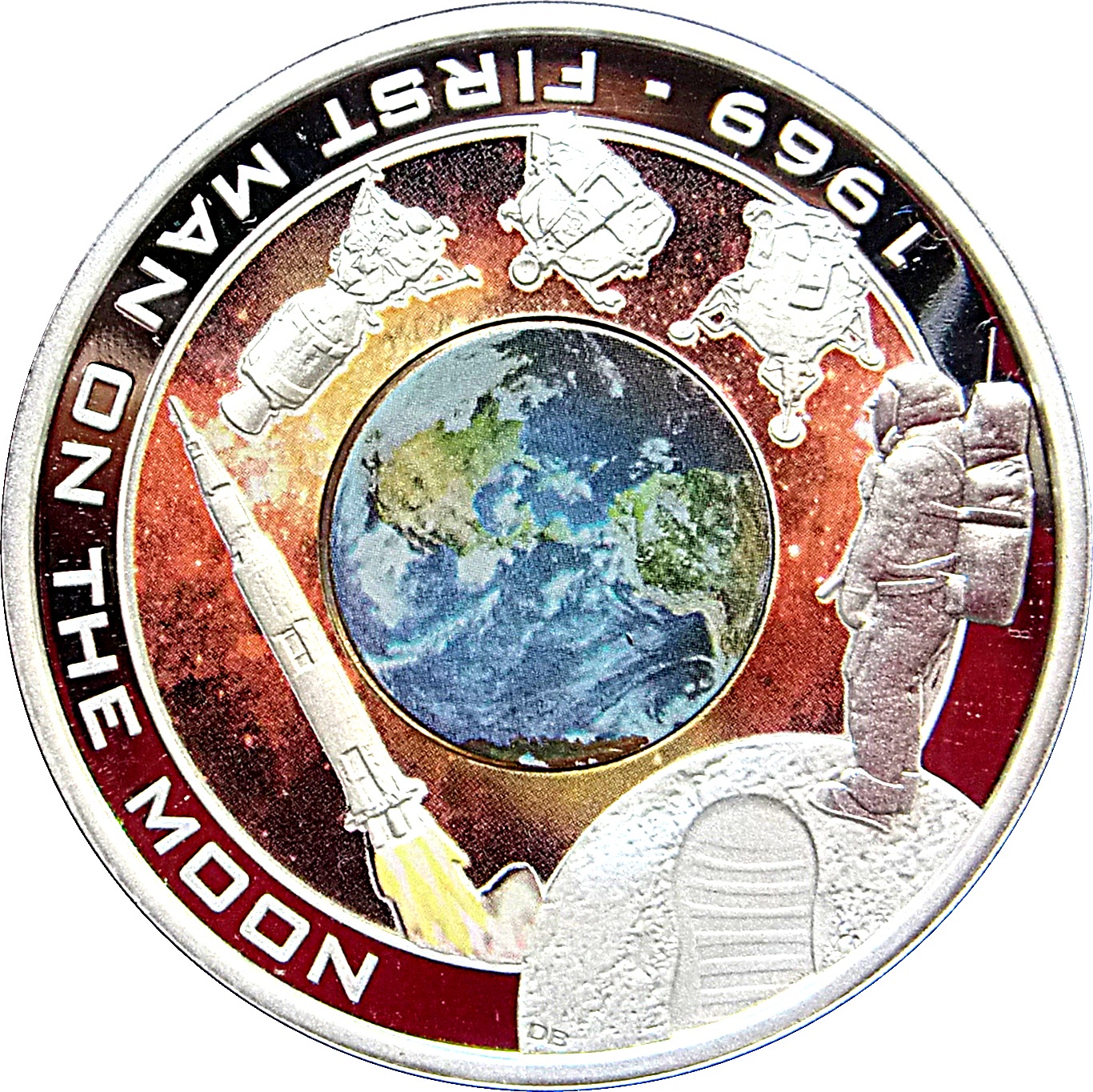 Описание: В центре изображена планета Земля, вокруг которой представлены основные этапы полета к Луне: ракета «Аполлон», космический корабль, лунный модуль, а в конце — космонавт и отпечаток стопы первого человека на Луне.