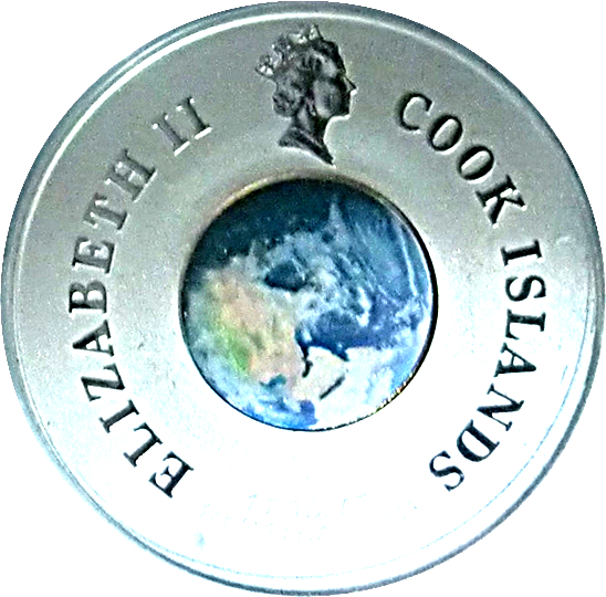 Описание: В центре изображение планеты Земля, вписанное в круг. Элизабет II, остров Кука, профиль Ее Величества королевы, 1 доллар, 1 унция, 999 серебра, 2009 год.