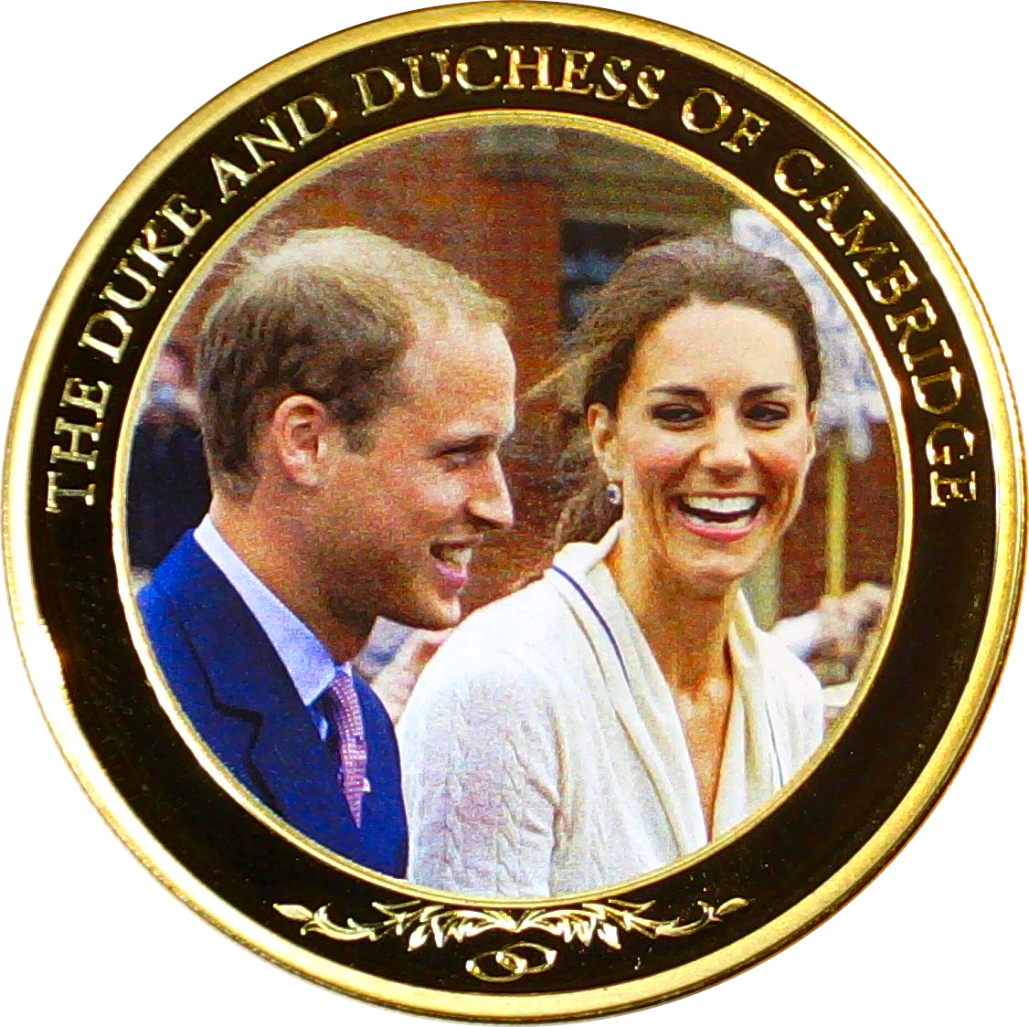 Описание: Цветная фотография улыбающихся герцога и герцогини Кембриджских (принца Уильяма и Кэтрин Миддлтон) Стилизованные переплетенные обручальные кольца Нижняя рамка Венок
