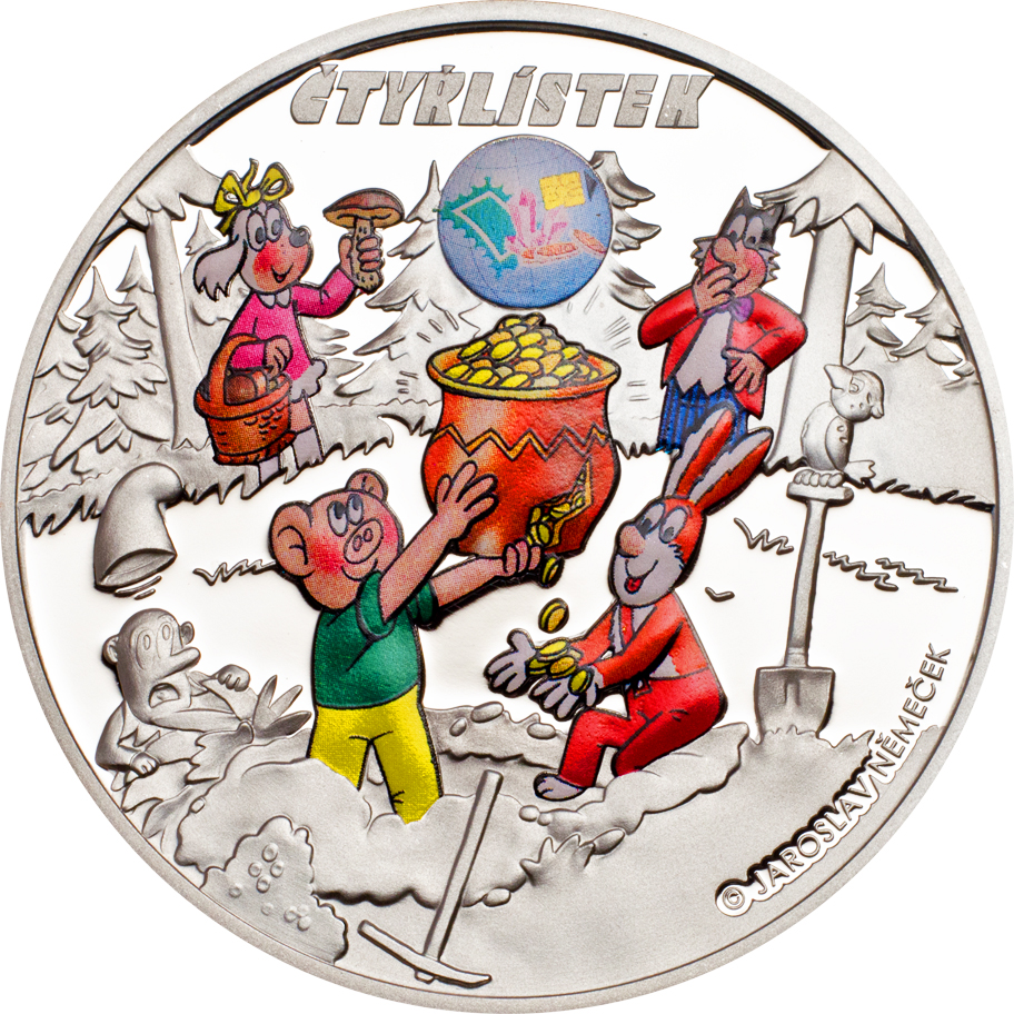 Описание: Цветные фигурки из чешского комикса «Čtyřlístek»: глупый кролик Пинда, крутой поросенок Бобик, умный кот Мышпулин и милая собачка Фифинка находят сокровище в лесу.