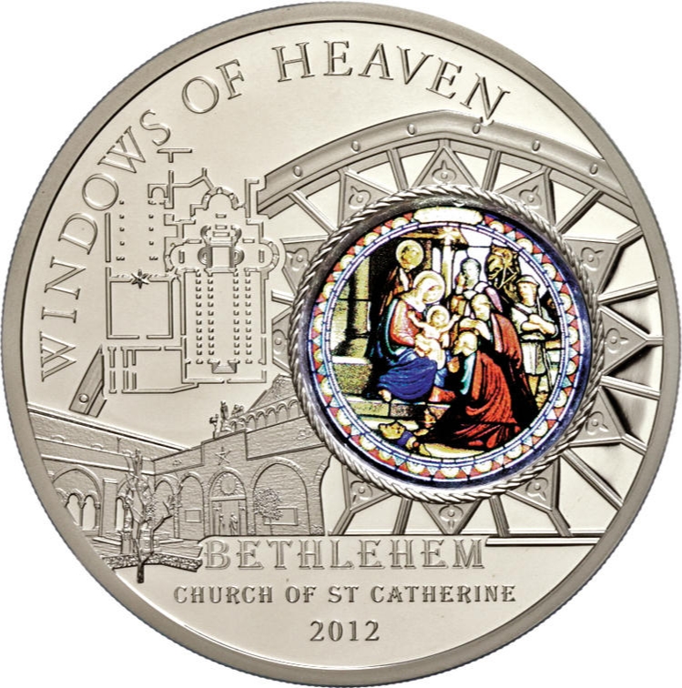 Описание: План расходов церкви Рождества Христова в Вифлееме — одной из старейших непрерывно действующих церквей в мире и самой старой в Святой Земле. Особую привлекательность монете придает полноцветная вставка в виде окна, которая является копией красиво оформленного витража церкви.