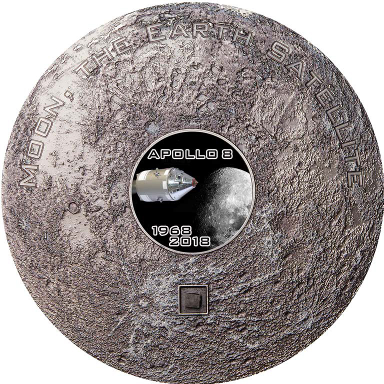 Описание: Рельеф Луны с кратерами разного размера. В центре реверса также имеется вставка из расписного декоративного стекла. В левой нижней части изображен фрагмент метеорита.
