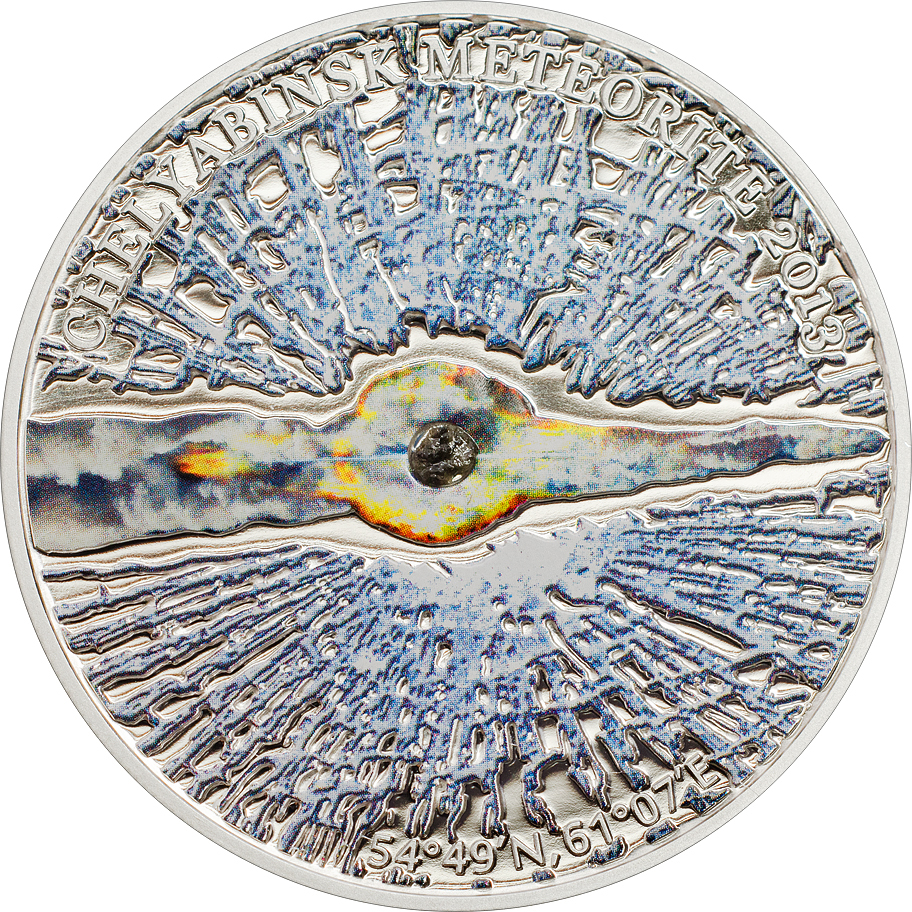 Описание: Зображення ударної хвилі метеорита, що проходить через атмосферу. Фрагмент справжнього метеорита вставлений у поверхню монети.