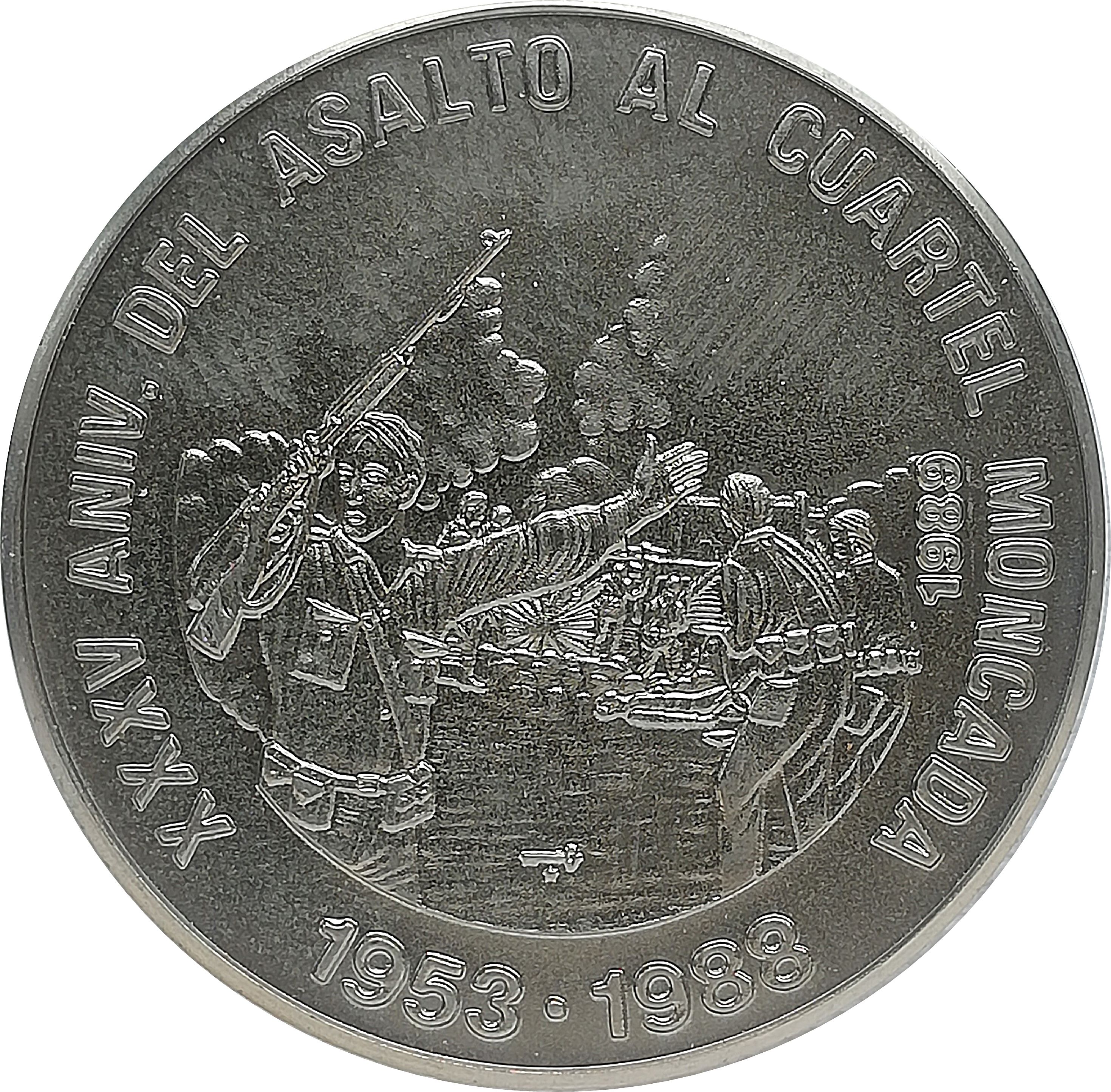 Описание: Сцена штурму гарнізону Монкада, назва події у вигляді вигнутої легенди з боків і зверху, дати внизу, рік випуску праворуч від зображення, знак монетного двору під зображенням.