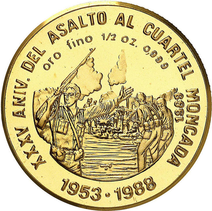 Описание: Сцена штурму гарнізону Монкада, назва події у вигляді вигнутої легенди з боків і зверху, дати внизу, рік випуску праворуч від зображення, знак монетного двору під зображенням. Вага та проба над зображенням.