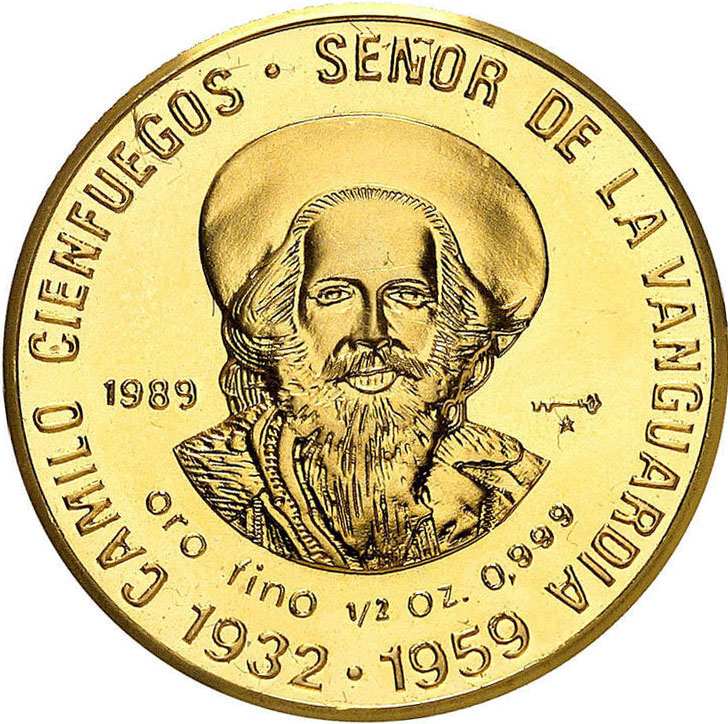 Описание: Бюст Каміло Сьєнфуегоса, ім'я фігури у вигляді вигнутої легенди зверху та з боків, роки життя знизу, рік випуску ліворуч, знак монетного двору праворуч. Вага та проба під зображенням.
