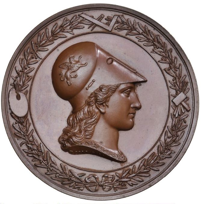 Описание: Внутри круга изображен крылатый Гений, держащий в правой руке венок, а в левой — перо. Снаружи, по кругу, дата расположена ниже, по бокам от нее находятся две лавровые ветви, а надпись — выше.