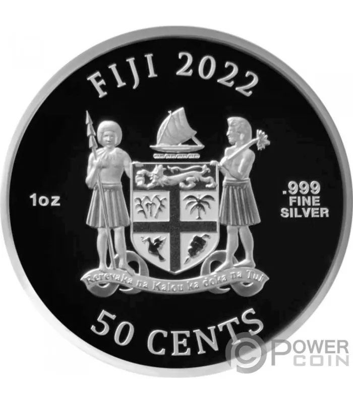 Описание: Герб Фиджи представляет собой четвертый щит с изображением сахарного тростника, кокосовой пальмы, голубя с оливковой ветвью и бушеля бананов. В верхней части четвертого щита изображен лев, идущий вперед и смотрящий вперед, держащий в лапах стручок какао. Над щитом находится каноэ с выносным опорным брусом, а по бокам его поддерживают фиджийские фигуры.