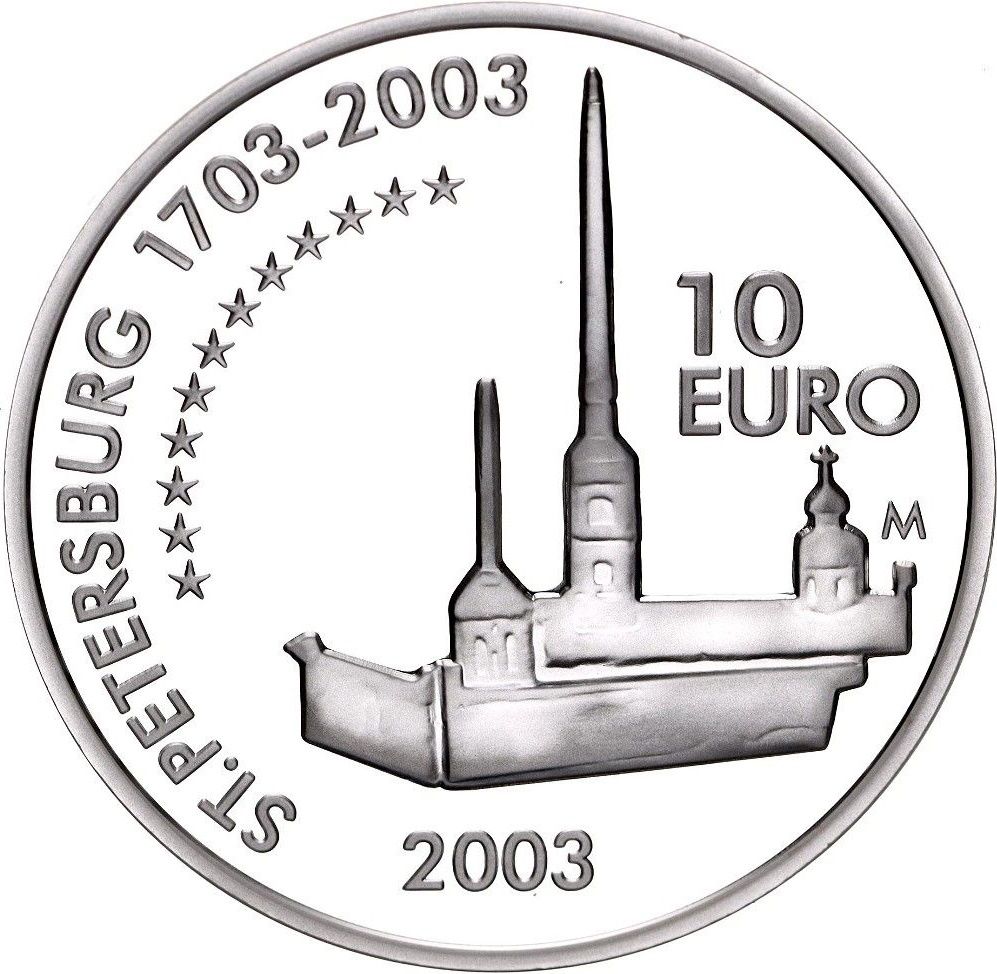 Описание: На зворотному боці монети зображено Санкт-Петербург із Петропавлівською фортецею та трьома баштами. На монеті можна побачити напис «Санкт-Петербург 1703-2003».