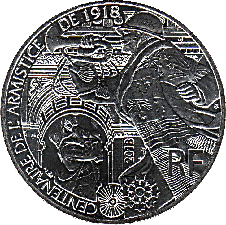 Описание: На звороті зображений сурмач, який оголосив про припинення вогню. Солдат носить кілька прапорів, а також волошку та мак. На задньому плані зображено Тріумфальну арку, під якою солдат, що повернувся з війни, тримає на руках свою дитину.