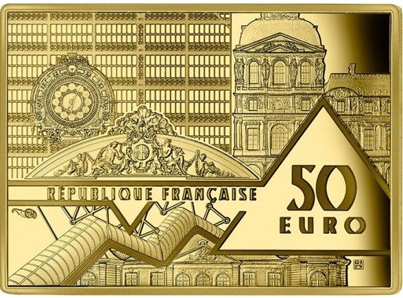 Описание: На аверсе изображены несколько видов многих крупных французских музеев. Внутренний вид Музея д'Орсе, в левом верхнем углу, узнаваем по характерным часам. Рядом с ним — вид фасада Лувра, как он виден со двора Наполеона, где находится пирамида. Ниже этих двух элементов на фреске изображен Отель Сале, в котором находится Музей Пикассо. В нижней части реверса изображен фасад Отеля Бирон, нынешнего Музея Родена, а над ним — знаменитая лестница Центра Помпиду.