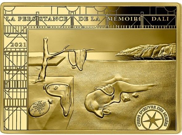Описание: На реверсе изображен знаменитый шедевр Сальвадора Дали «Упорство памяти». В правом нижнем углу добавлен штамп «Museum Masterpiece», который определяет эту серию и гармонично вписывается в композицию. На заднем плане изображен фасад музея Бобур, где Сальвадор Дали был героем нескольких выставок, последняя из которых состоялась в 2013 году. Название произведения и имя художника также дополняют оформление.