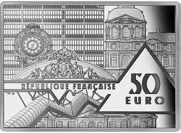 Описание: На аверсе изображены несколько видов многих крупных французских музеев. Внутренний вид Музея д'Орсе, в левом верхнем углу, узнаваем по характерным часам. Рядом с ним — вид фасада Лувра, как он виден со двора Наполеона, где находится пирамида. Ниже этих двух элементов на фреске изображен Отель Сале, в котором находится Музей Пикассо. В нижней части реверса изображен фасад Отеля Бирон, нынешнего Музея Родена, а над ним — знаменитая лестница Центра Помпиду.
