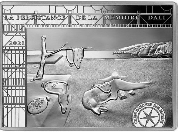 Описание: На реверсе изображен знаменитый шедевр Сальвадора Дали «Упорство памяти». В правом нижнем углу добавлен штамп «Museum Masterpiece», который определяет эту серию и гармонично вписывается в композицию. На заднем плане изображен фасад музея Бобур, где Сальвадор Дали был героем нескольких выставок, последняя из которых состоялась в 2013 году. Название произведения и имя художника также дополняют оформление.