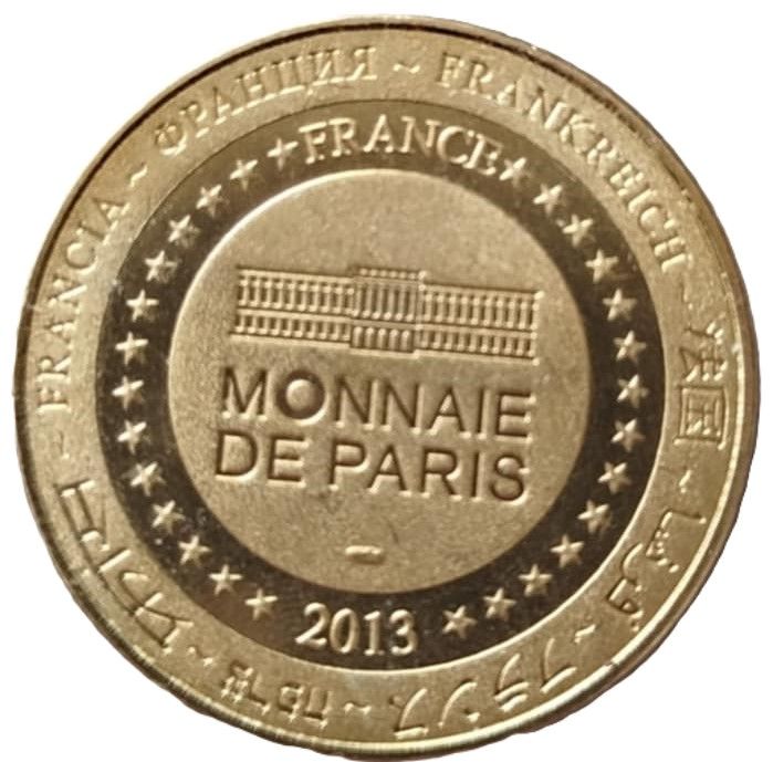 Описание: На периферії слово «Франція» написано вісьмома мовами. Франція на 12-й годині, 2013 рік на 6-й годині, все пов'язане 14 зірками праворуч і ліворуч. У центрі — будівля Монетного двору Парижа.