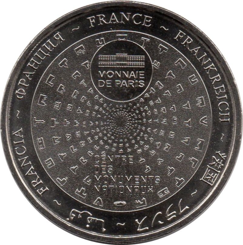 Описание: На периферії слово «Франція» написано сімома мовами. У положенні «12 годин» зображено будівлю Monnaie de Paris у колі. Піктограми Centre des Monuments Nationaux сходяться в центрі.