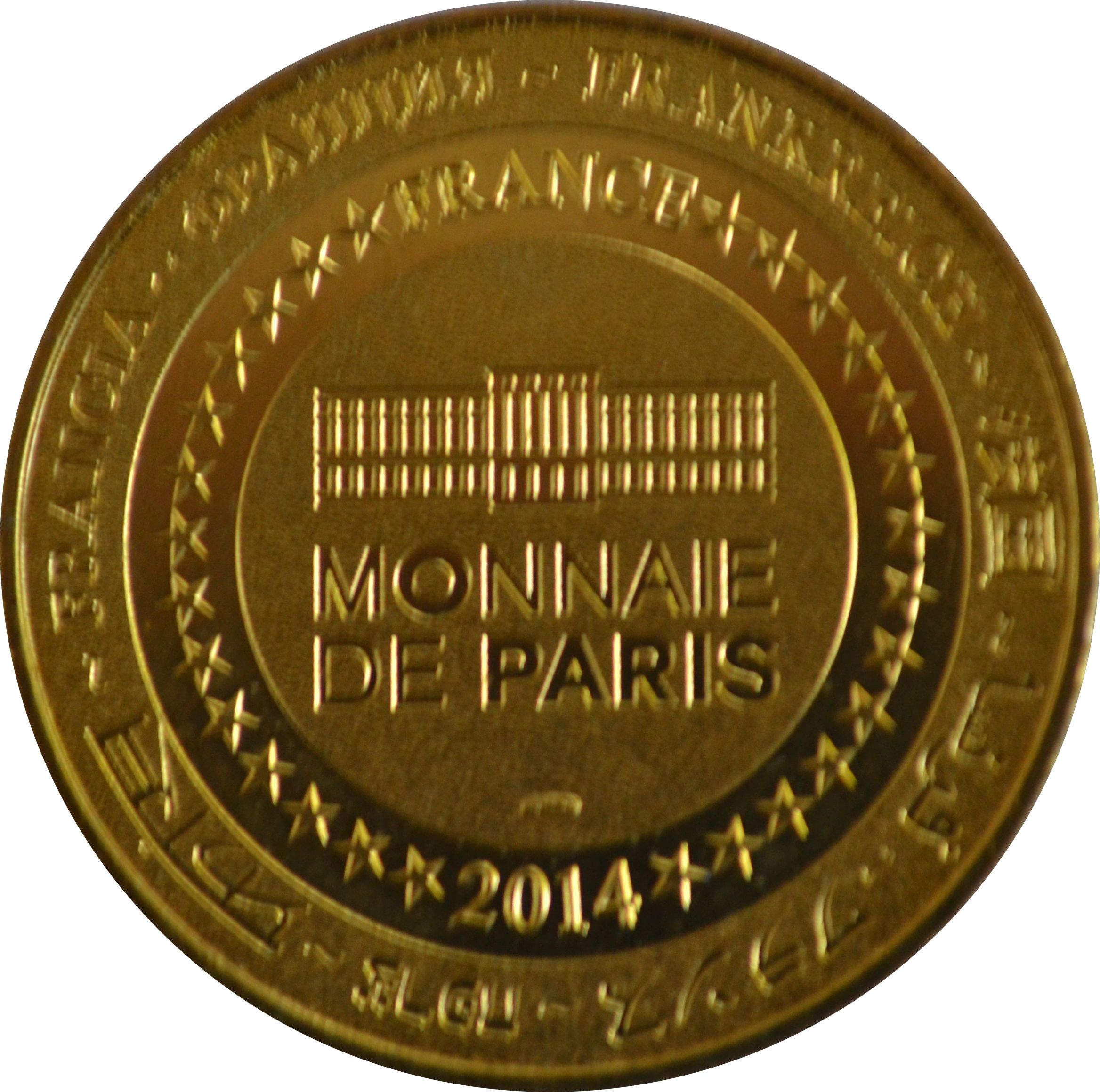 Описание: На периферії слово «Франція» написано вісьмома мовами. Франція на 12-й годині, 2014 рік на 6-й годині, все пов'язане 14 зірками праворуч і ліворуч. У центрі — будівля Моне де Парі. Слово «PARIS» має бути виділено жирним шрифтом для монет 2014 року випуску.