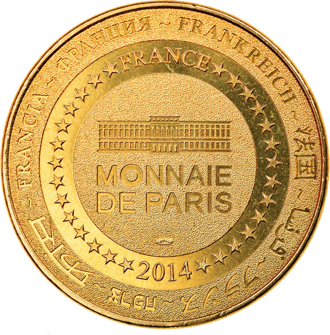 Описание: На периферії слово «Франція» написано вісьмома мовами. Франція на 12-й годині, 2014 рік на 6-й годині, все пов'язане 14 зірками праворуч і ліворуч. У центрі — будівля Моне-де-Парі.