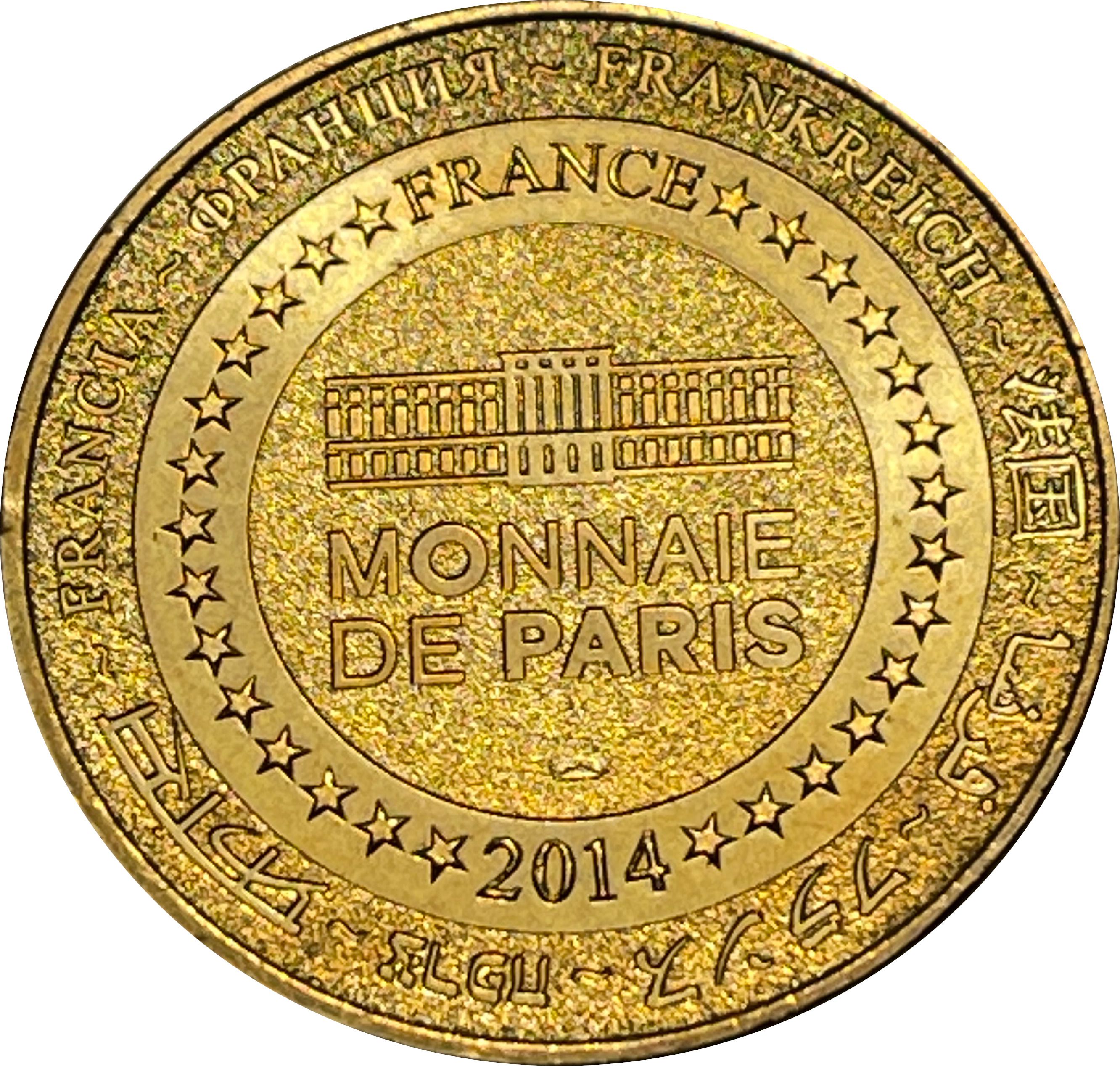 Описание: На периферії слово «Франція» написано вісьмома мовами. Франція на 12-й годині, 2014 рік на 6-й годині, все пов'язане 14 зірками праворуч і ліворуч. У центрі — будівля Моне де Парі.