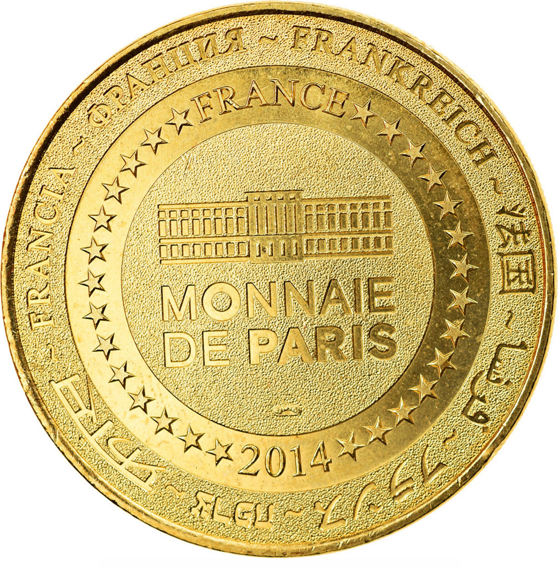 Описание: На периферії слово «Франція» написано вісьмома мовами. Франція на 12-й годині, 2014 рік на 6-й годині, все пов'язане 14 зірками праворуч і ліворуч. У центрі — будівля Моне де Парі.