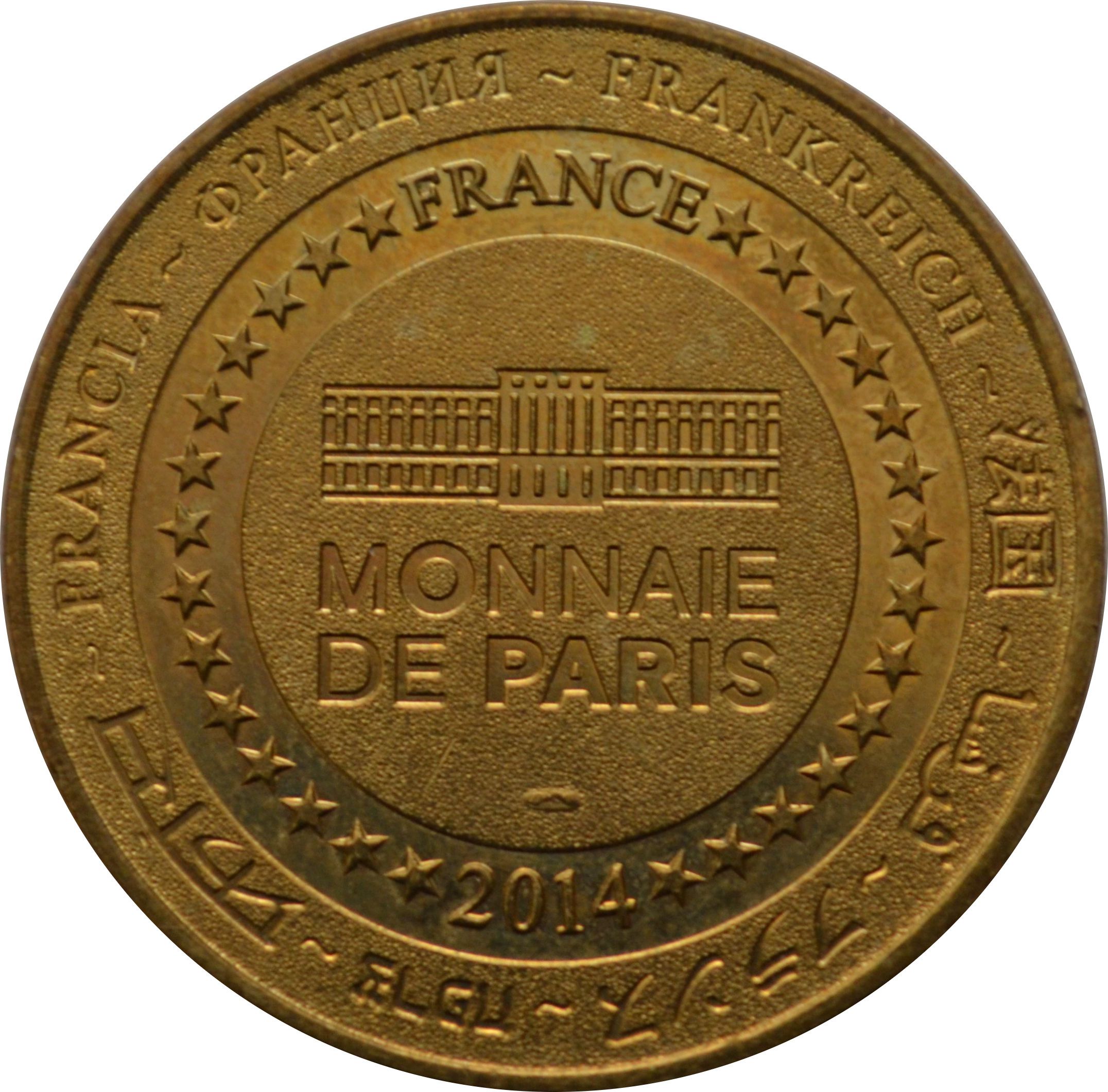 Описание: На периферії слово «Франція» написано вісьмома мовами. Франція на 12-й годині, 2014 рік на 6-й годині, все пов'язане 14 зірками праворуч і ліворуч. У центрі — будівля Monnaie de Paris. Слово «PARIS» має бути виділено жирним шрифтом для монет 2014 року.