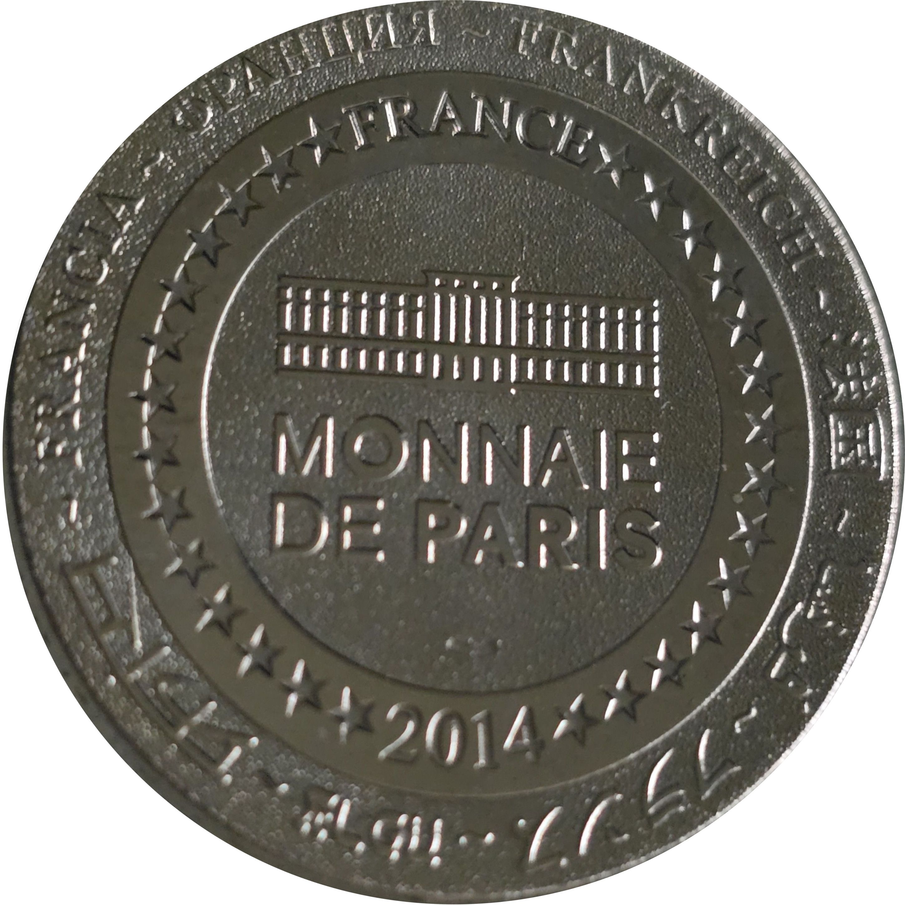 Описание: На периферії слово «Франція» написано вісьмома мовами. Франція на 12-й годині, 2014 рік на 6-й годині, все пов'язане 14 зірками праворуч і ліворуч. У центрі — будівля Моне де Парі.
