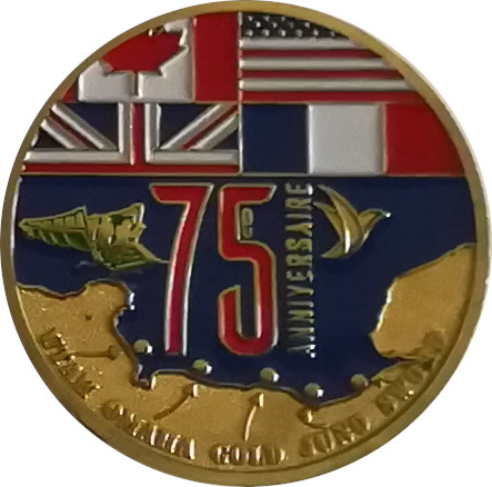 Описание: У верхній частині зображено чотири прапори: канадський, американський, британський та французький, а нижче — карта з п'ятьма пляжами висадки в Нормандії. Зліва зображено десантний катер, а праворуч — голуб.