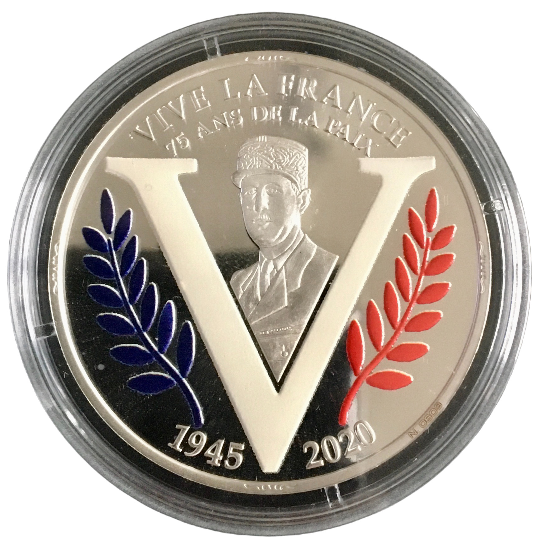 Описание: Портрет генерала де Голля. Переможна буква V та кольорові пальми. Індивідуальний номер вигравіруваний на обідку під червоною пальмою.