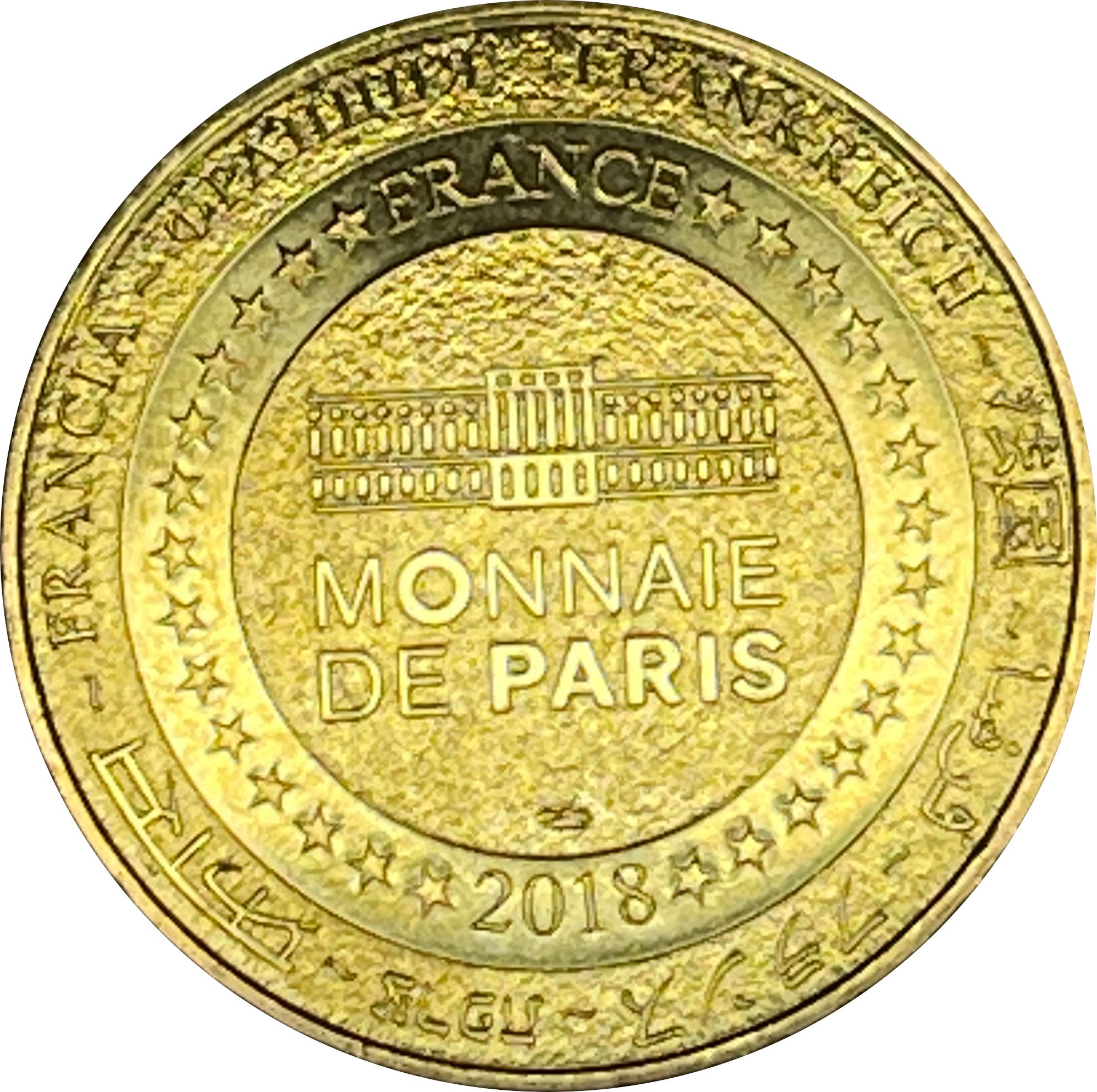 Описание: На периферії слово «Франція» написано вісьмома мовами. Франція на 12-й годині, 2018 рік на 6-й годині, все пов'язане 14 зірками праворуч і ліворуч. У центрі — будівля Моне-де-Парі.