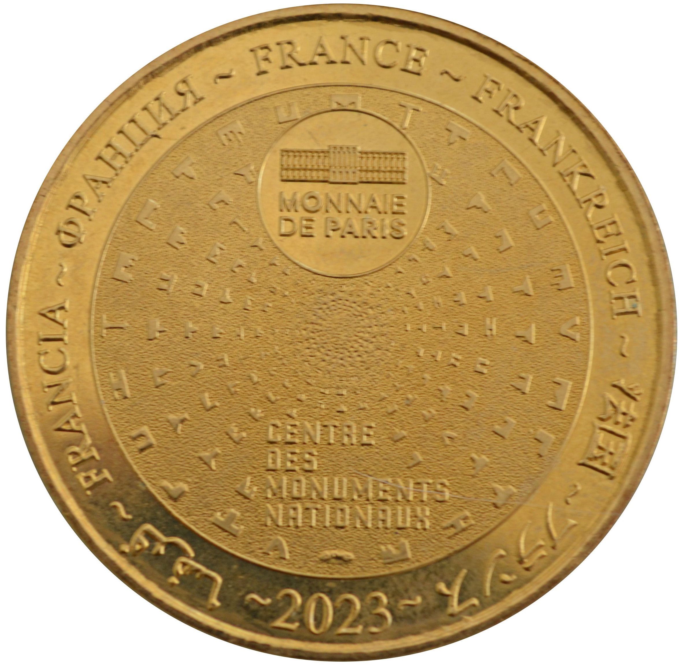 Описание: На периферії слово «Франція» написано сімома мовами. У положенні «12 годин» зображено будівлю Monnaie de Paris у колі. Піктограми Centre des Monuments Nationaux сходяться в центрі.