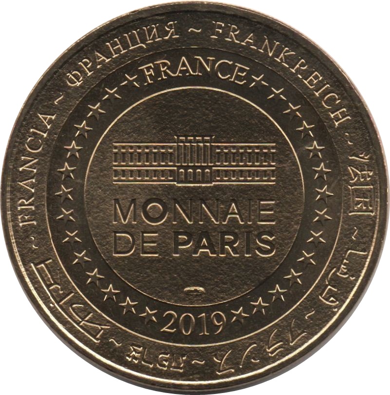 Описание: На периферії слово «Франція» написано вісьмома мовами. Франція на 12-й годині, 2019 рік на 6-й годині, все пов'язане 14 зірками праворуч і ліворуч. У центрі — будівля Моне де Парі.