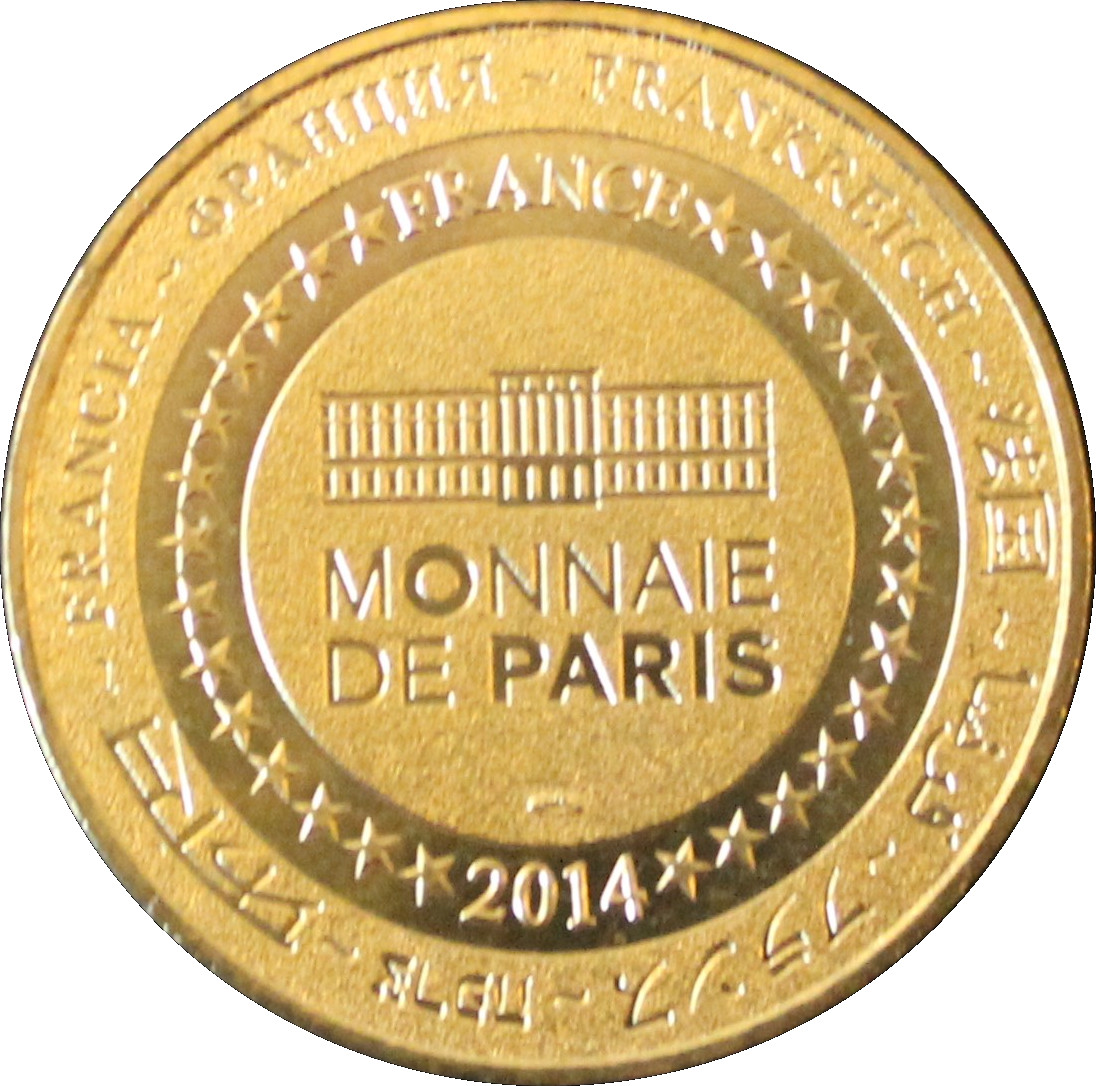 Описание: На периферії слово «Франція» написано вісьмома мовами. Франція на 12-й годині, 2014 рік на 6-й годині, все пов'язане 14 зірками праворуч і ліворуч. У центрі — будівля Моне де Парі.