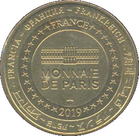 Описание: На периферії слово «Франція» написано вісьмома мовами. Франція на 12-й годині, 2019 рік на 6-й годині, все пов'язане 14 зірками праворуч і ліворуч. У центрі — будівля Моне де Парі.